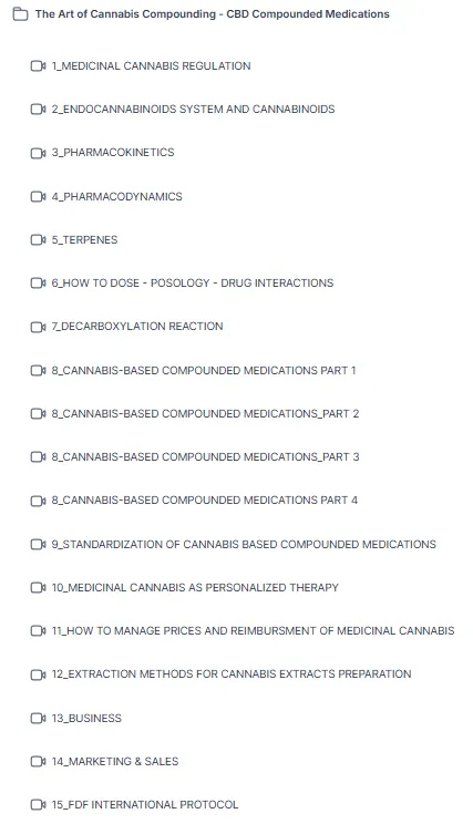 Modules covering regulations, compounding, operations, marketing, and sales of magistral cannabis preparations.