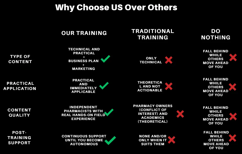 Direct and ongoing support from me, step by step, until you become fully independent in the field and are able to grow your compounding pharmacy.